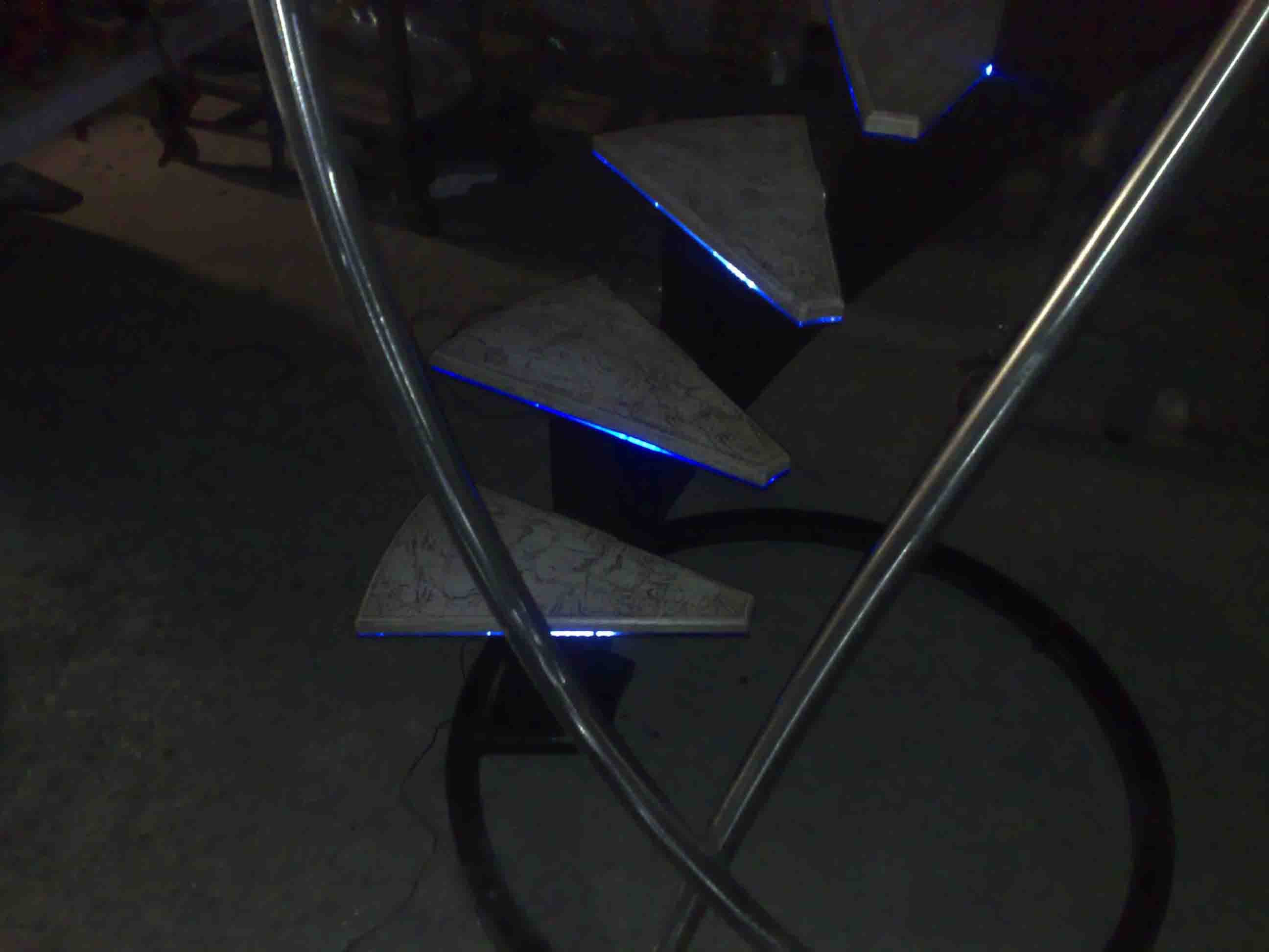 Scala a chiocciola con struttura centrale a cremagliera elicoidale, gradini supportati da lamiera in ferro sp.5mm, a vostra scelta il gradino può essere illuminato da Led colorati , medinate l'inserimento di una lastra di policarbonato tra il supporto e il gradino in legno, il quale può avere la classica finitura o una verniciatura ad effetto a scelta.